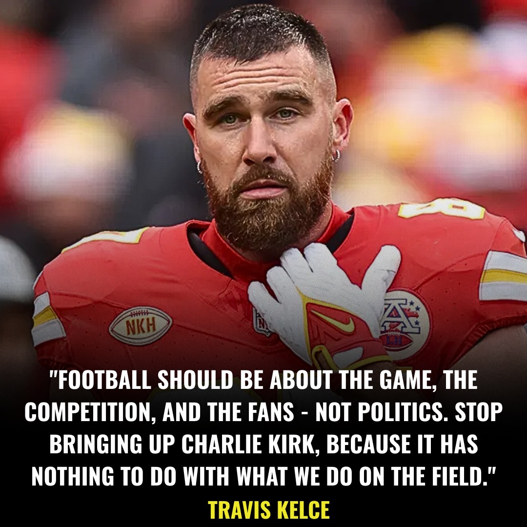 “Football should not be associated with politics,” Kelce said firmly, his tone unflinching. “Stop mentioning Charlie Kirk because this game is about unity, teamwork, and the fans — not political agendas.”