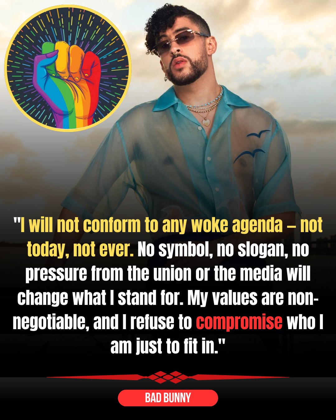 May be a graphic of ‎1 person and ‎text that says '‎100 م "I will not conform to any woke agenda -not today. not ever. No symbol, no slogan, no pressure from the union or the media will change what stand for. My values are non- negotiable, and I refuse to compromise who I am just to fit in." BAD BUNNY‎'‎‎
