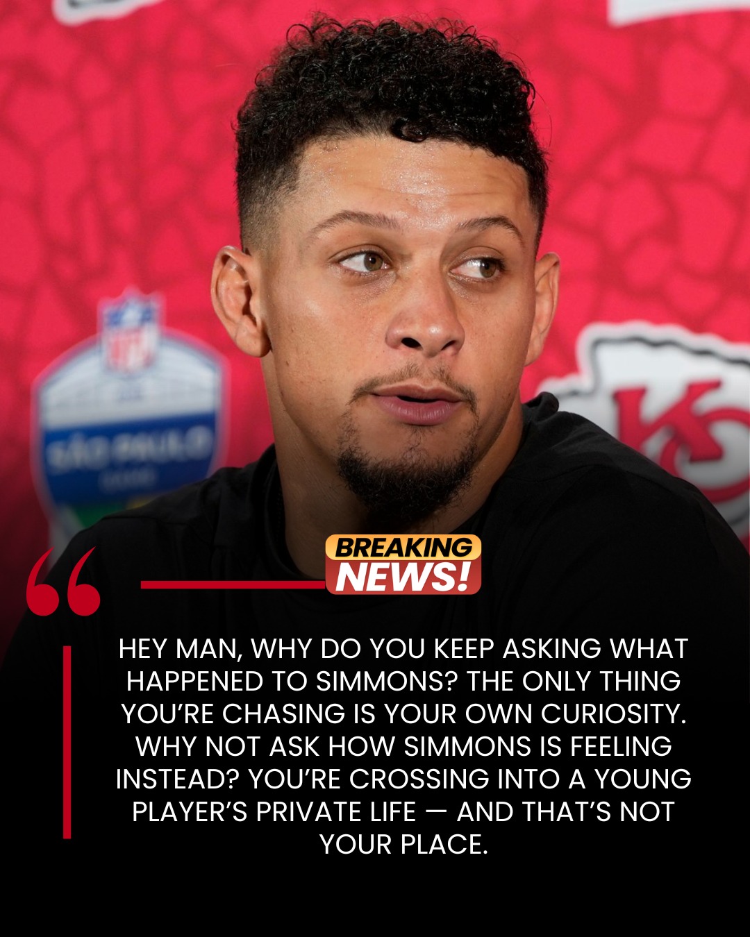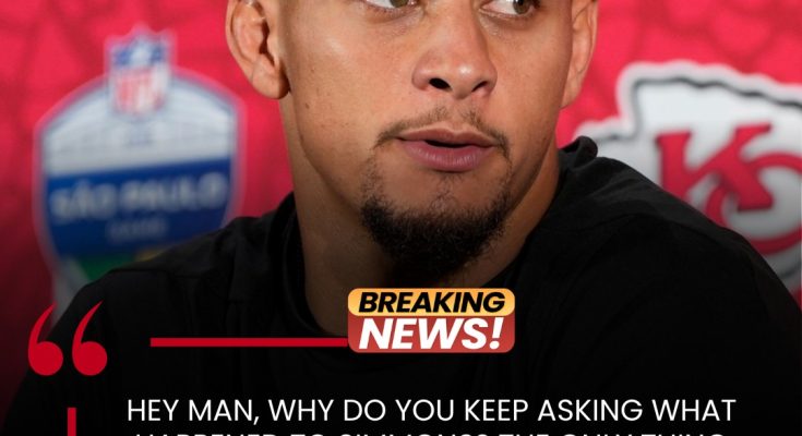 Mahomes usually calm expression shifted. He took a breath, leaned toward the mic, and fired back with rare frustration. “Hey man, why do you keep asking what happened to Simmons?”