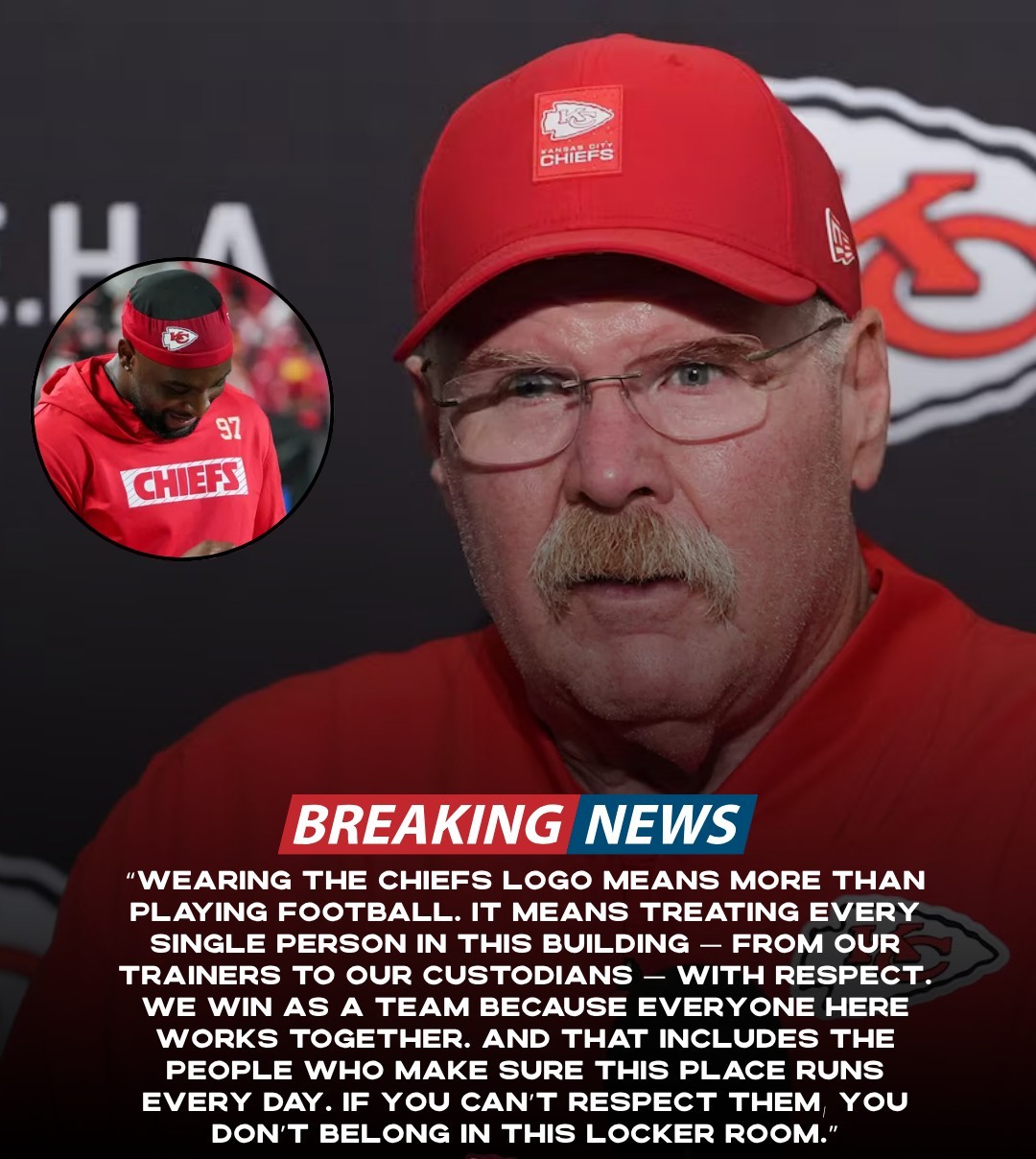 The following morning, Reid called a full team meeting. Without naming anyone, his message was unmistakable: “Wearing the Chiefs logo means more than playing football,” Reid said. “It means treating every single person in this building — from our trainers to our custodians — with respect. We win as a team because everyone here works together. And that includes the people who make sure this place runs every day. If you can’t respect them, you don’t belong in this locker room.”