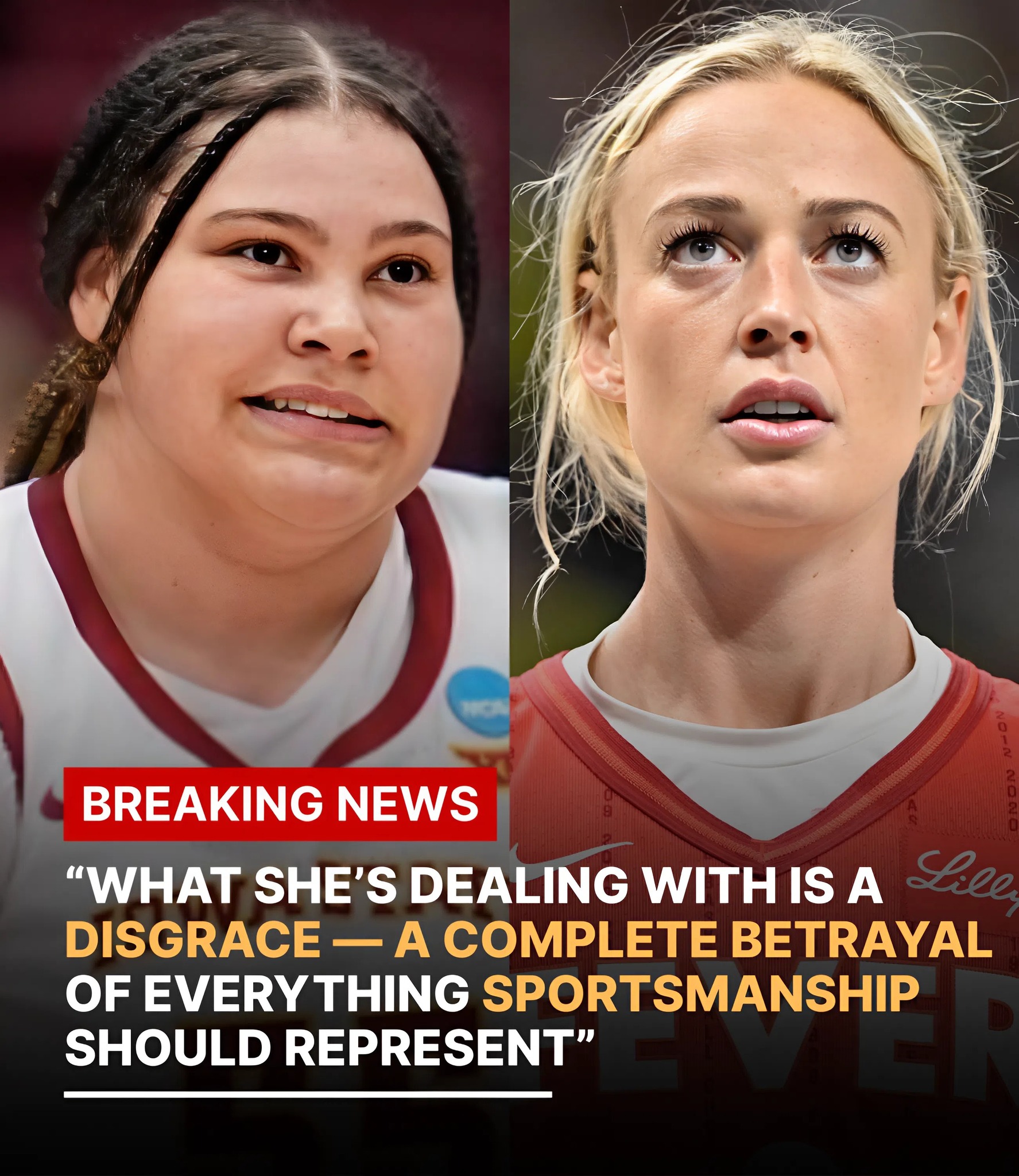 May be an image of basketball and text that says 'RilDn BREAKING NEWS " SHE'S DEALING WITH IS A DISGRACE- A COMPLETE BETRAYAL OF EVERYTHING SPORTSMANSHIP SHOULD REPRESENT"'