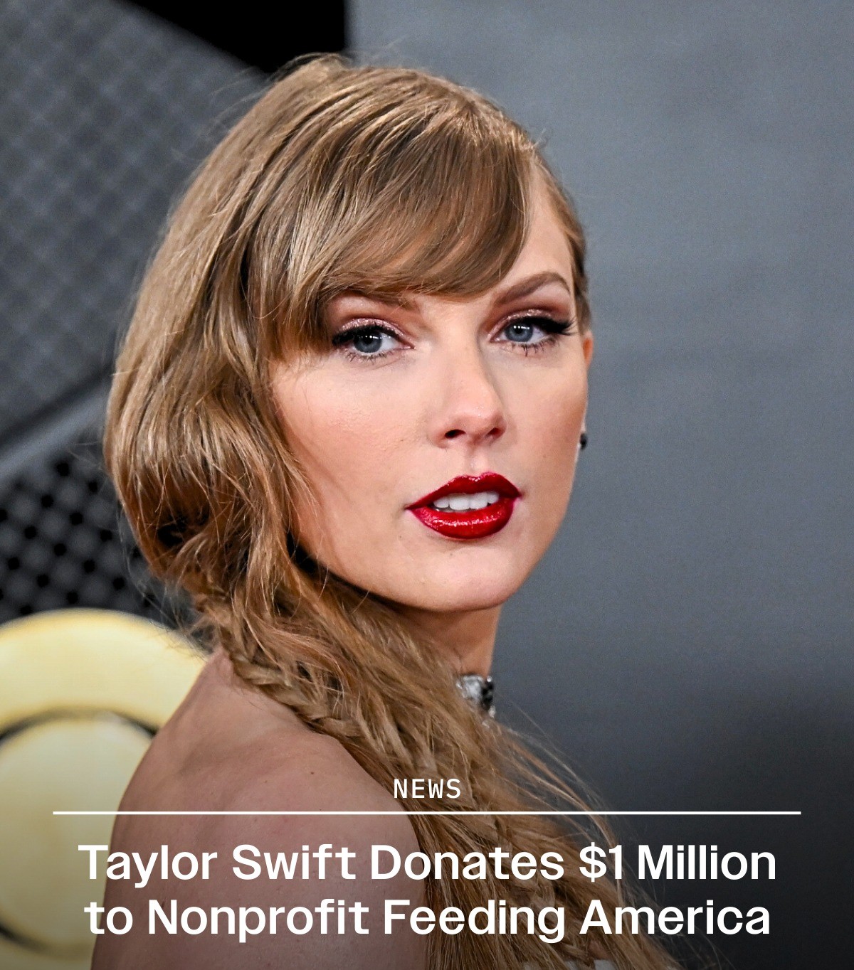 The charity announced the donation on Instagram, thanking the singer for her act of altruism. “We are incredibly grateful for Taylor Swift‘s $1 million gift to Feeding America,” reads the post, authored by Feeding America CEO Claire Babineaux-Fontenot. “This holiday season, her continued support is a powerful reminder of what’s possible when we unite to end hunger. When we join together alongside people facing hunger, we can make sure families have a full table this holiday season and beyond.”