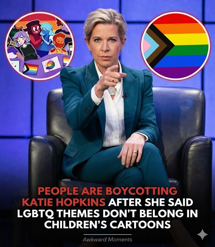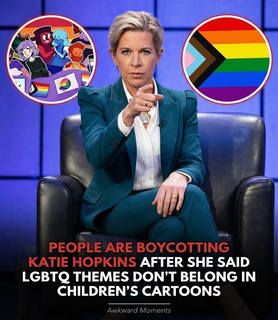 May be an image of text that says "PEOPLE ARE BOYCOTTING KATIE HOPKINS AFTER SHE SAID LGBTQ THEMES DON'T BELONG IN CHILDREN'S CARTOONS Awkward Moments โร"